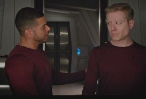 But actually, there is a rainbow. At the end of the fifth episode two officers that we’ve gotten to know individually, Lt. Stamets (Anthony Rapp) and Dr Culber (Wilson Cruz), are revealed to be a gay couple.